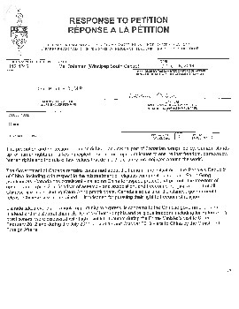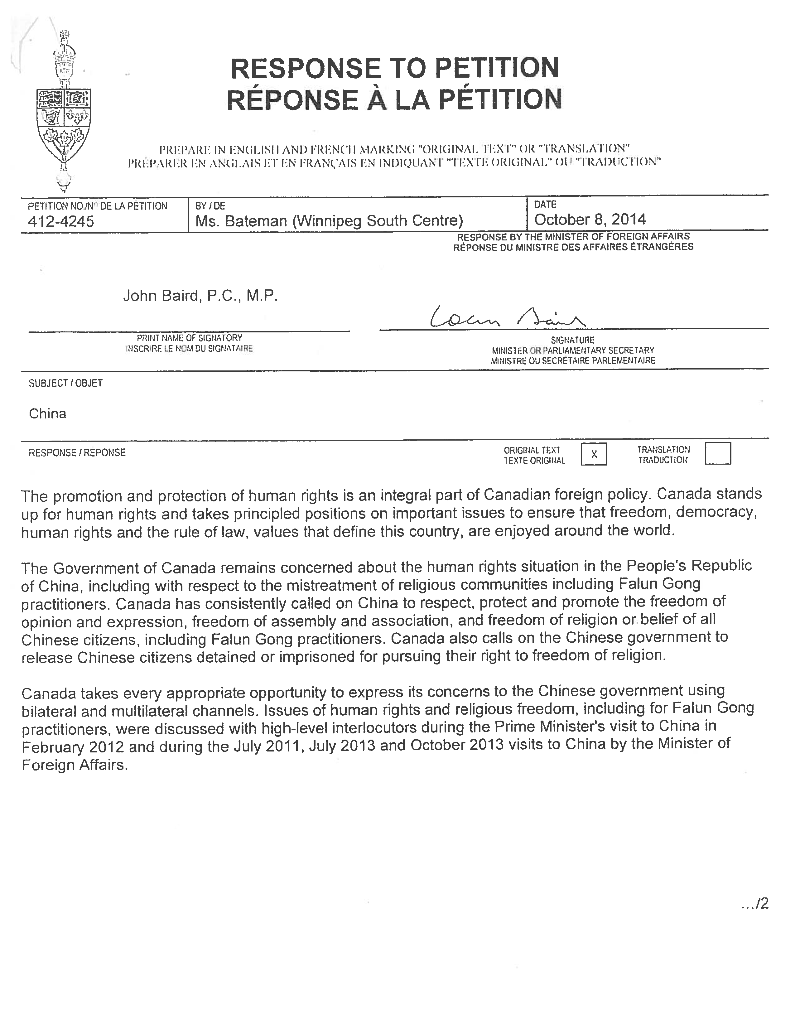 据规定,外交部长约翰•贝尔德(John Baird)需对每个议员作出回应。他在回应中表明了加拿大始终如一坚持维护人权和信仰自由,并利用每一个合适的机会表达关注法轮功遭受的迫害。