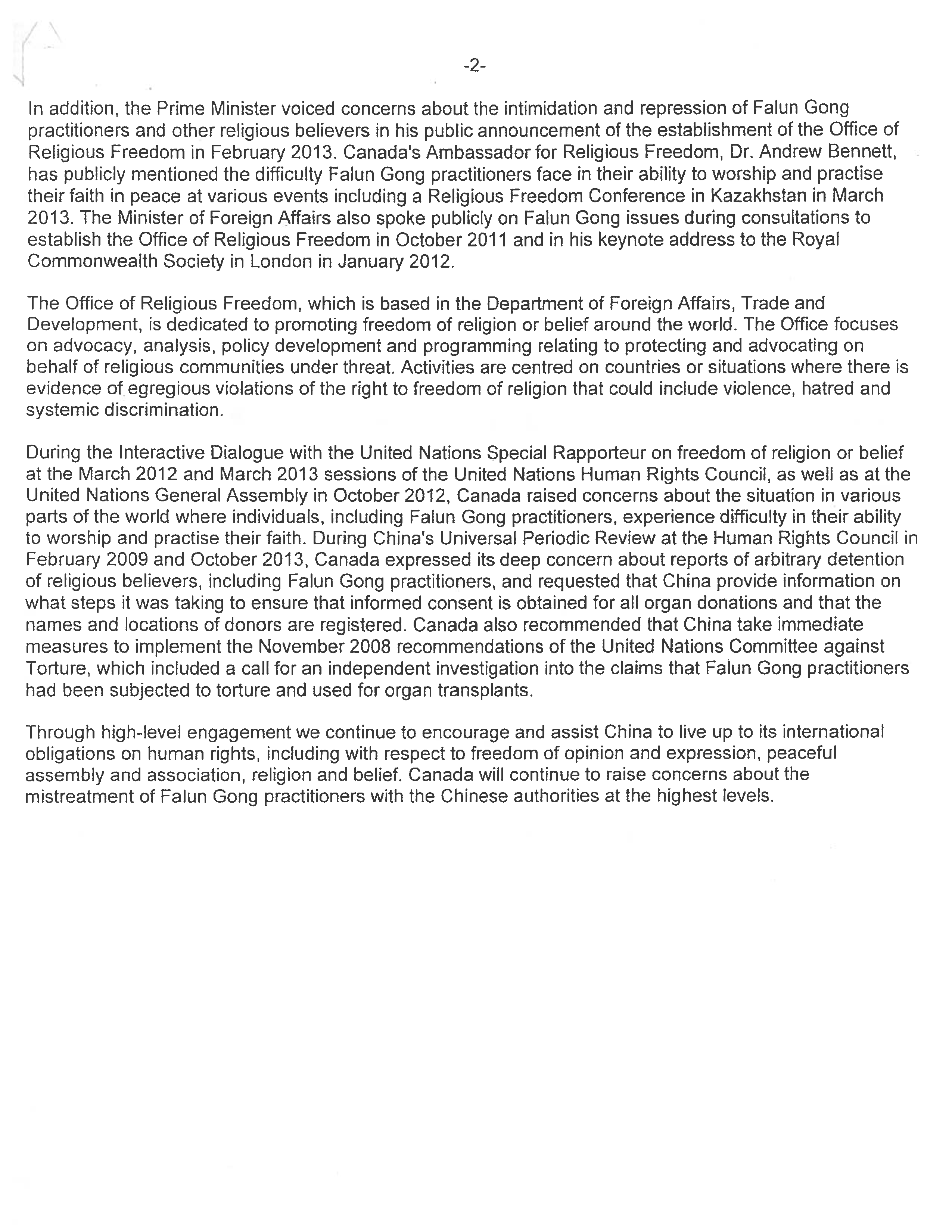 “此外,二零一三年二月,总理曾在加拿大信仰自由办公室成立的公开声明中,发声关注法轮功学员和其他信仰人士受到的恐吓和打压。加拿大信仰自由大使安德鲁•伯内特(Andrew Benett)曾公开在不同场合,包括在二零一三年三月哈萨克斯坦信仰自由大会上,提出能够和平的坚持信仰的法轮功学员所面临的困境。二零一一年十月,在成立信仰自由办公室的咨询中,外交部长也公开提出了对法轮功(受迫害)的关注。并在二零一二年一月,在伦敦给皇家联邦协会(Royal Commonwealth Society)的关键提示中也提到了法轮功。”