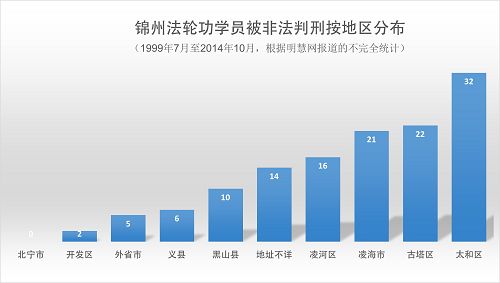 2、锦州地区被非法判刑法轮功学员所在区域分布图:(锦州市区包括:古塔区、凌河区、太和区、开发区,周边市县包括:凌海市、黑山县、义县、北宁市)
