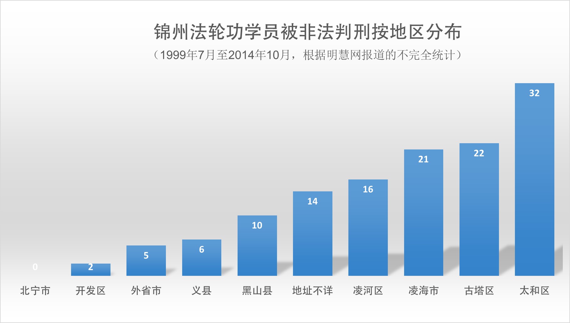 从一九九九年七二零起,截止到二零一四年十月三十一日的十五年间,据不完全统计,明慧网刊登的锦州地区被非法判刑的法轮功学员有128人。其中:男性45人,女性81人,性别不详2人,女性占总人数的63% ,年龄最高的73岁。