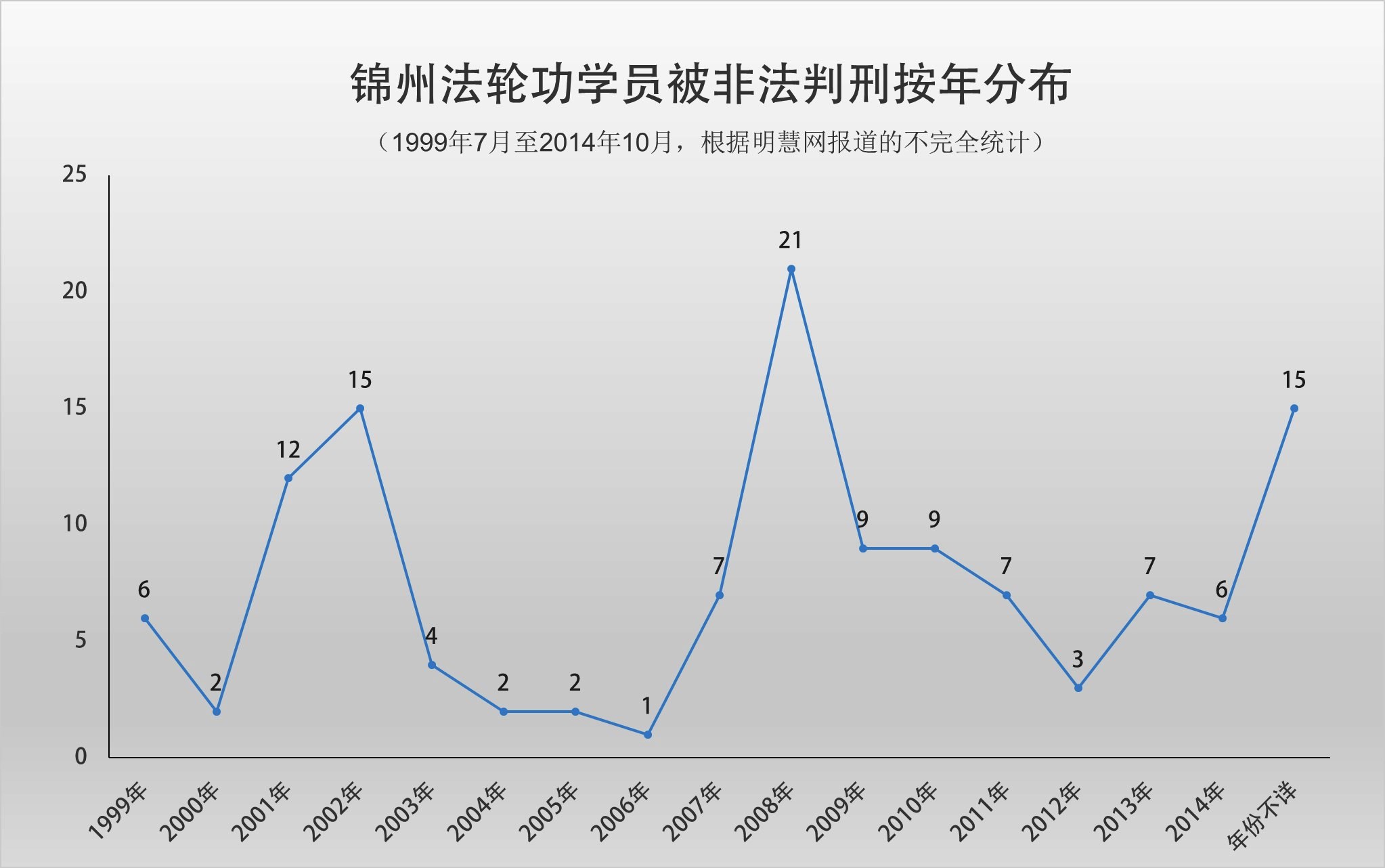 被非法判刑的法轮功学员的高峰期在2002年和2008年,分别是15、21人。十五年来,锦州地区每年平均被非法判刑超过8人。