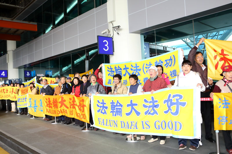 十六日下午两点半,陈德铭抵达桃园机场准备离台,一下车就听到法轮功学员高喊“法轮大法好,中共停止迫害法轮功”。陈德铭匆匆步入离境大厅。准备出境的各国旅客纷纷拿出手机拍下法轮功学员站在低温寒风中,和平理性传达正义呼声的身影。