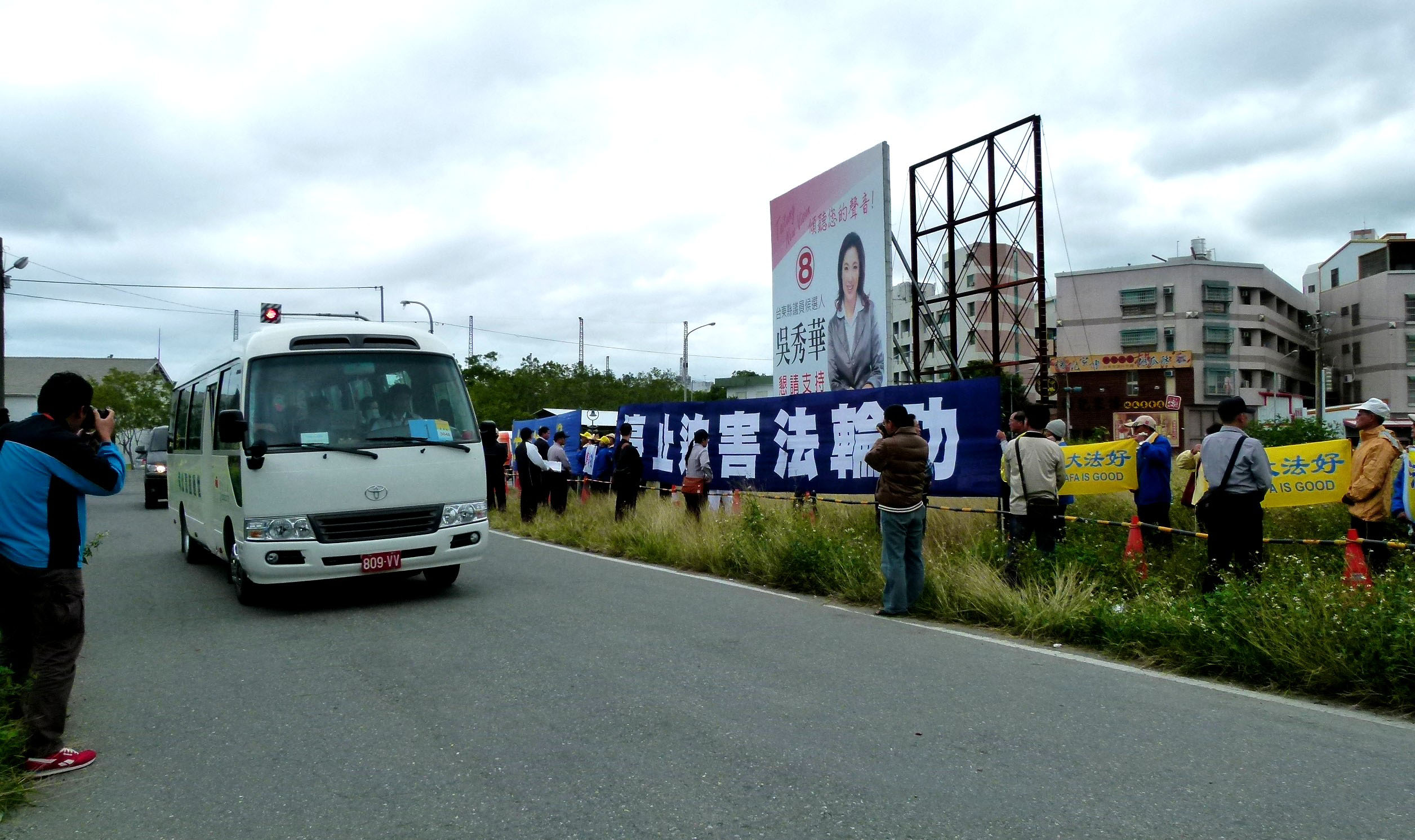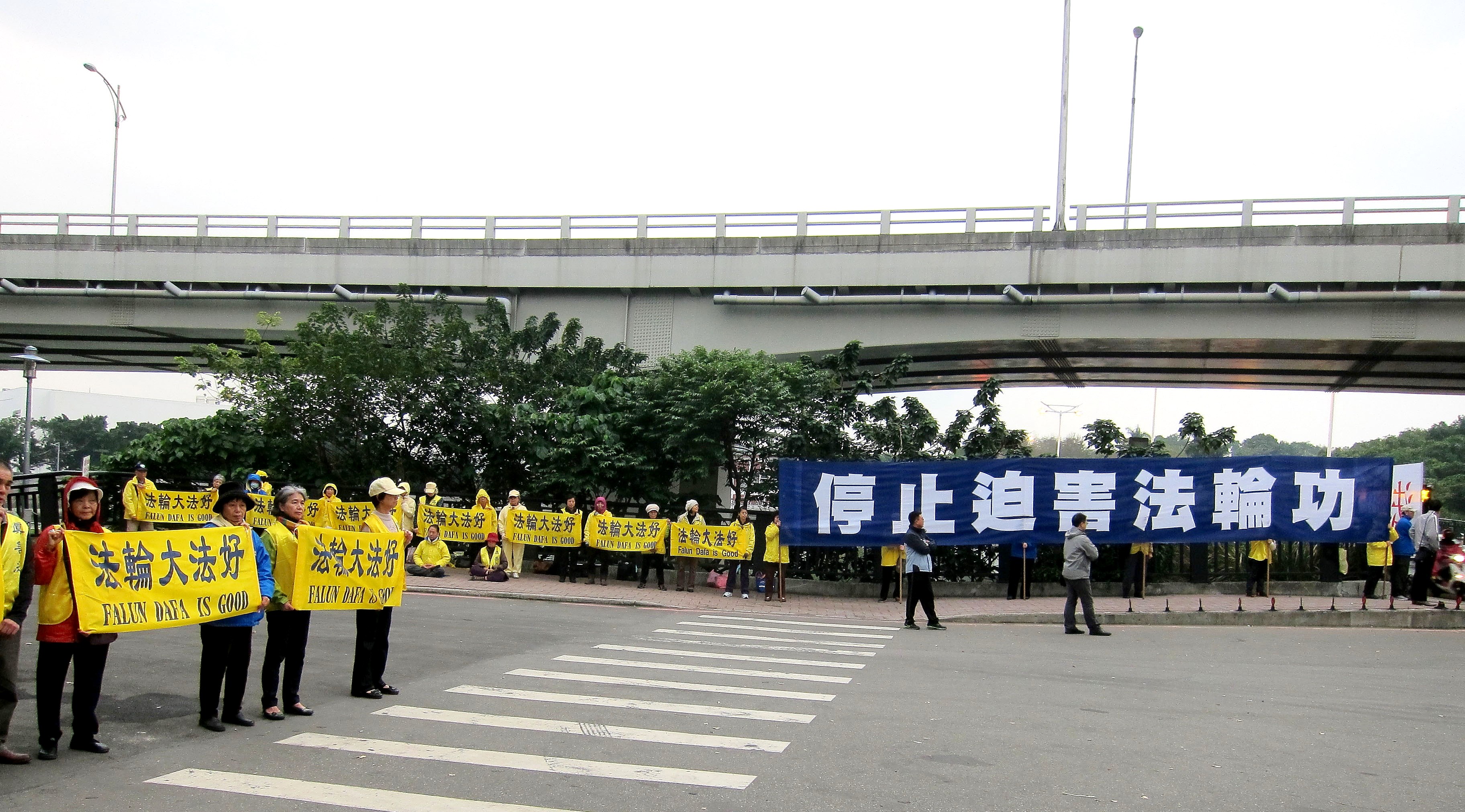 ![]() 图3:中共海协会长陈德铭十二日率团抵台东,法轮功学员在中兴路旁举横幅反迫害 |