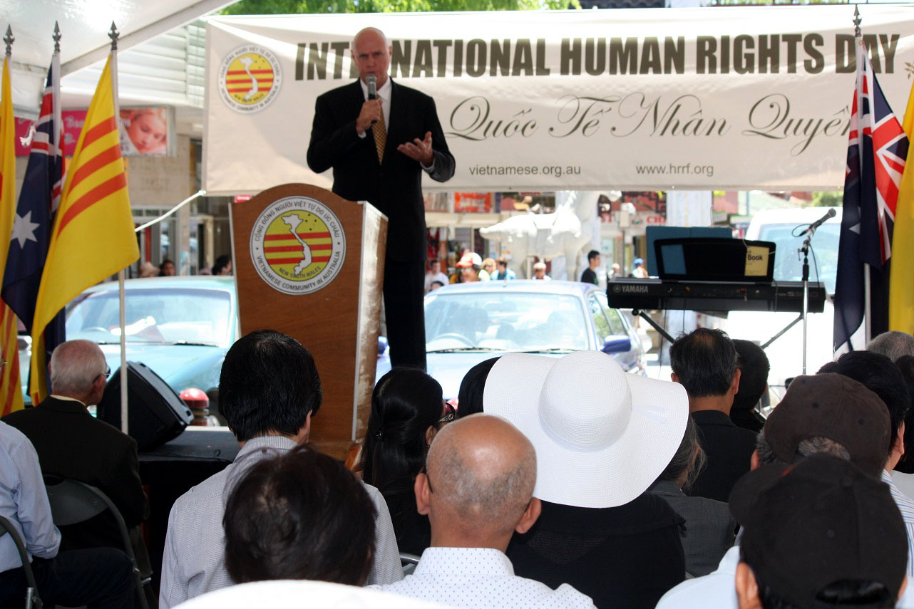 为了提高人们对人权问题的关注而举办此集会的前越南社团澳洲新南威尔士州分部主席阮律师(Than Nguyen)就目前世界人权问题发展近况发表见解:“目前科技发展很快,但是纵观世界各国的人权和尊严并没有相应得到尊重。在澳洲,我们非常幸运地生活在民主、人权自由国家。这意味着我们有义务去给世界上很多违背人权的国家施压。有时候我们生活在自由民主国家的人们很容易忘记那些生活在没有基本人权国家的人们。我们必须记得那些为人权而做出牺牲的人们。如那些在中国为了信仰自由而被非法关押在狱中的法轮功学员们,更甚者,他们为了维护自己的信仰而被活摘器官贩卖。这些事我们必须让人们知道,并为此做些什么帮助。”