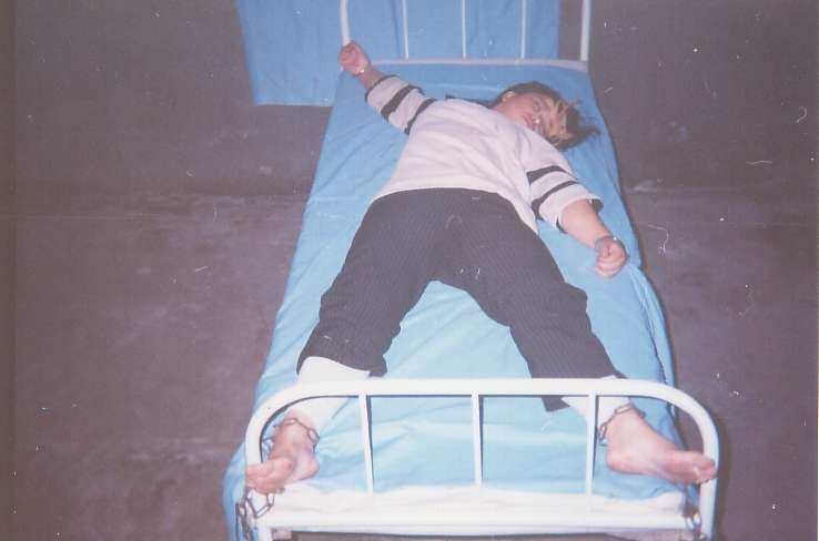 后来渐渐清醒过来后,在邪恶的环境中我选择了绝食反迫害抵制邪恶。迫害前我一百三十八斤的体重,从迫害到绝食两个月左右,只剩下六十多斤。吸毒犯在恶警的唆使下随时打我、眯眼就马上遭毒打,罚坐军姿,强行灌食等。吸毒犯邓林、陈××等几个人强迫我坐军姿,她们在背后按住我两边肩膀,用膝盖猛踢我腰部,由于反复折磨我站不起也蹲不下,把我折磨得不象人样,随时都有生命危险,我闭目躺在铁床上,队长李琪(音)在我鼻子处探看有无气息。