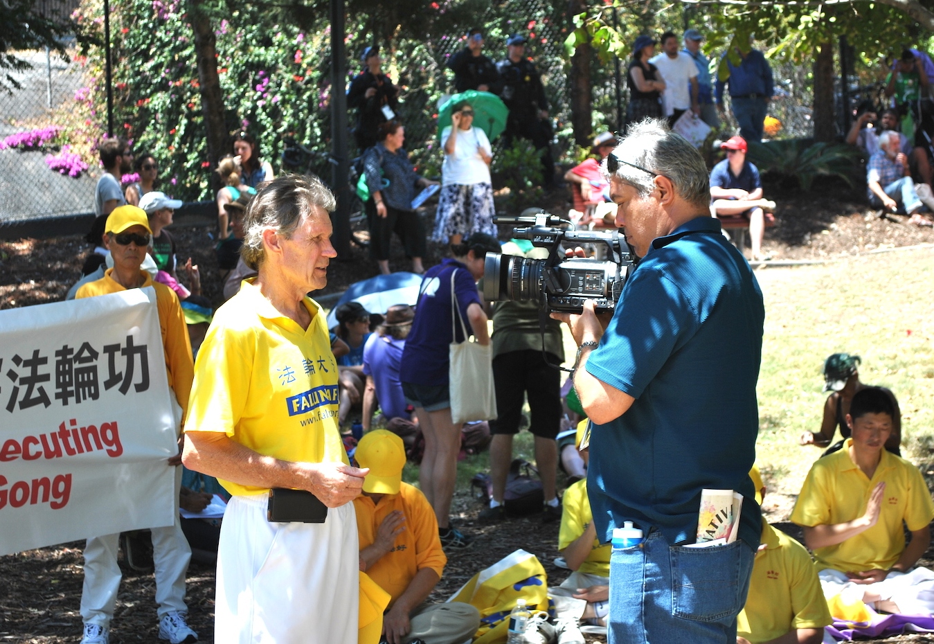 悉尼晨锋报的记者主动过来和西人法轮功学员史密斯(Ben Smith)交谈,了解了法轮功学员为何在布里斯本市中心拉横幅、呼吁停止迫害后,他说:如果中共派人来捣乱,请你们立刻通知我,我会过来做报导。之后他将名片递给了史密斯。