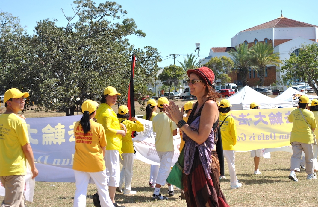 活动结束时,从悉尼去昆省的身穿黄衣服的法轮功学员燕妮和艾玛及一些学员们在其他团体都离开后,仍然在那教别人炼功。法轮功学员还把地上的纸屑捡得干干净净,使得现场那些中国学生看了感叹说:还是法轮功耐得住!你们辛苦了,真是不简单,赶快回去休息吧!之后他们不再闹事了,并对法轮功学员十分客气。后来,燕妮和艾玛在一旁路边举起“停止迫害法轮功”的横幅,所有走过的外国人都竖起大拇指赞扬,并拿取了法轮功真相资料。