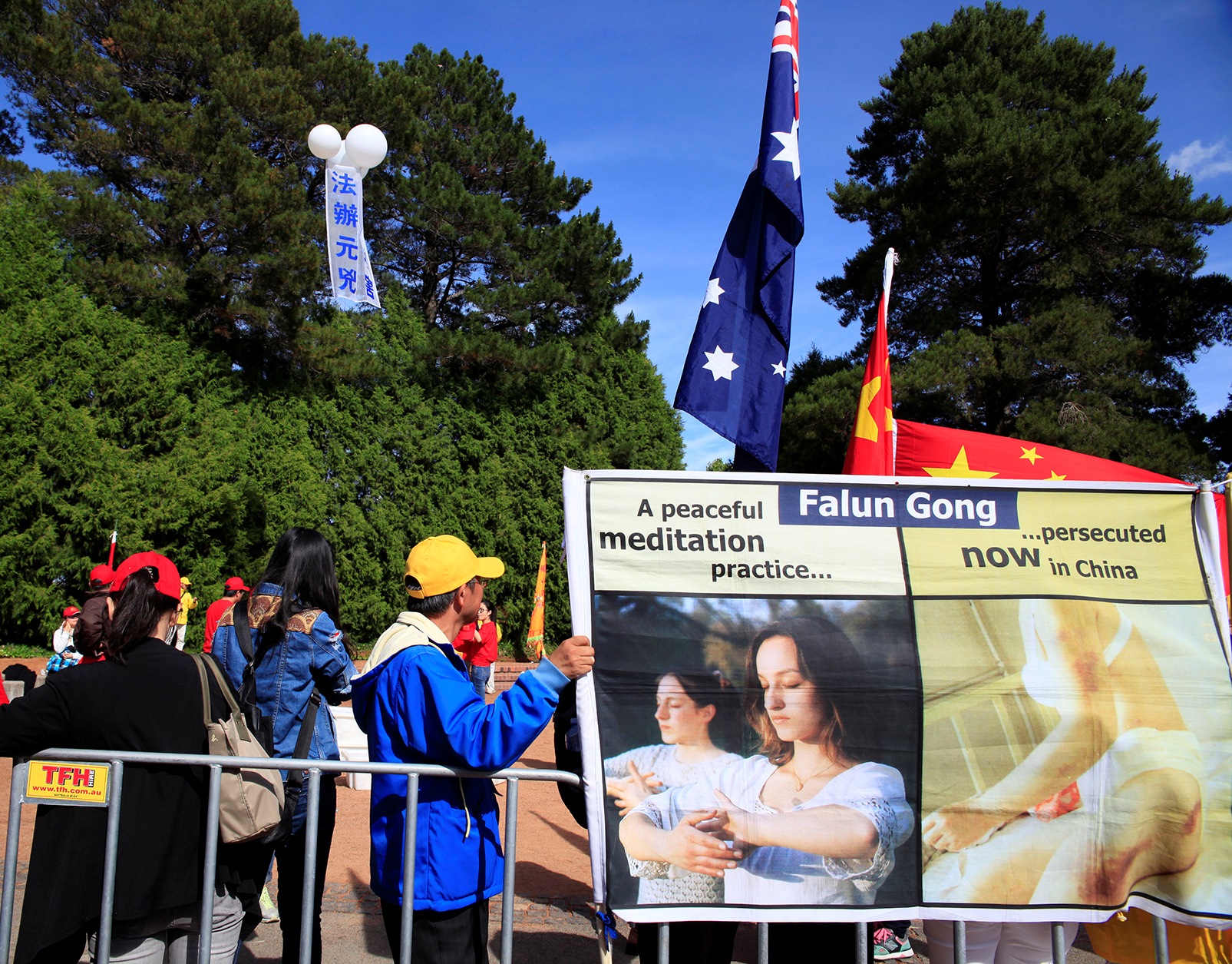 十一月十六日,在习*近*平入住的堪培拉凯悦宾馆后门,数名法轮功学员从早上六点多开始打横幅,早上七点多,一些不明真相的华人学生用血旗挤压法轮功横幅,并筑成旗墙把学员们都挡到后排。法轮功修炼者们祥和平静地站了十几个小时不吃不喝不上洗手间。期间学生们不断挤压、谩骂,甚至挑衅地在两位墨尔本法轮功学员脚下打鼓到晚上八点多钟,法轮功修炼者们面对如此不公,仍保持心态平稳。在习*近*平的车队来到之前一小会儿,一辆警车开过来,从车上走下来一位警察,他突然走向堪培拉法轮功学员钟莉莉,快速拿过她手中的横幅,在那些学生被动一侧身还没有反应过来时,警察交还给钟女士的横幅已经高高举起,展示在所有的血旗前面。几乎在同一时间,在钟女士所在地角的对街,发生了同样的一幕。