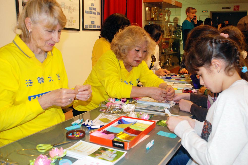 在真相展台上的叠纸莲花活动,很多小朋友都热心的边学边听着法轮功学员讲述着真相。
