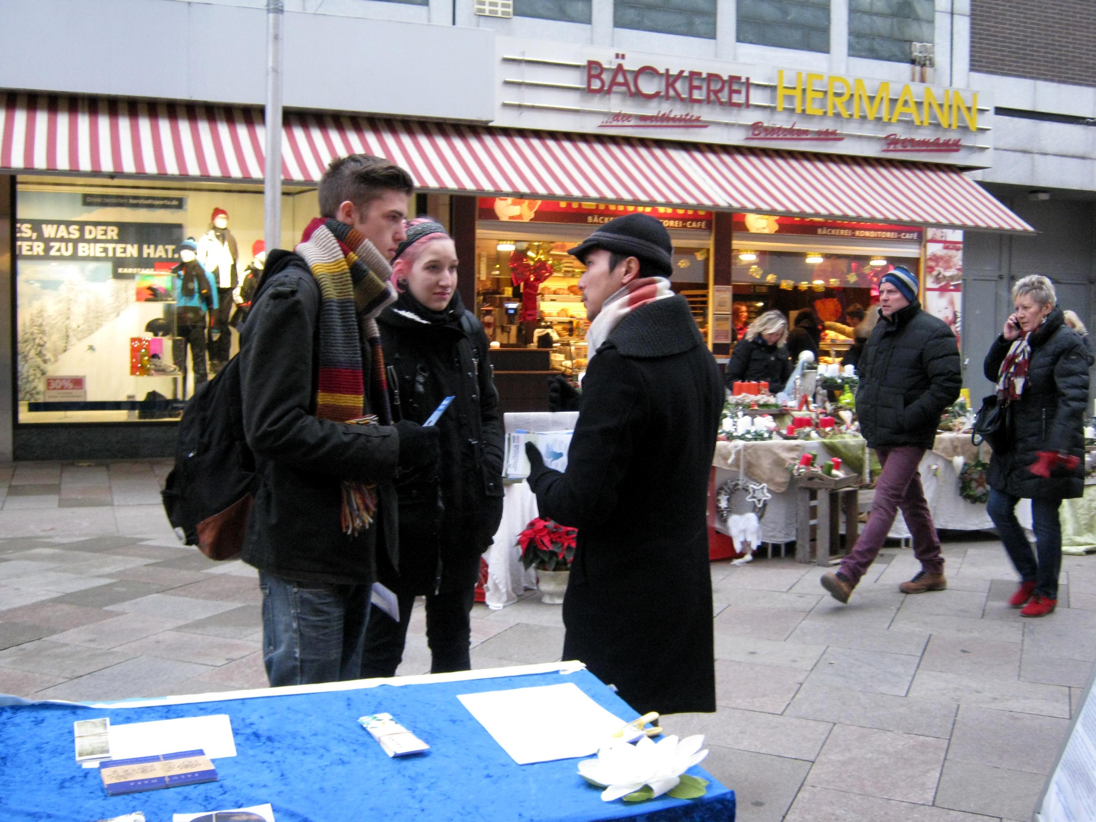 在哥廷根住着来自不同国家族裔的人们。一位当地的学员是大学生,来自伊朗,她在当天遇见了许多伊朗同胞并以波斯语或英语和他们交谈,他们都很感动并高兴的接受了信息材料。