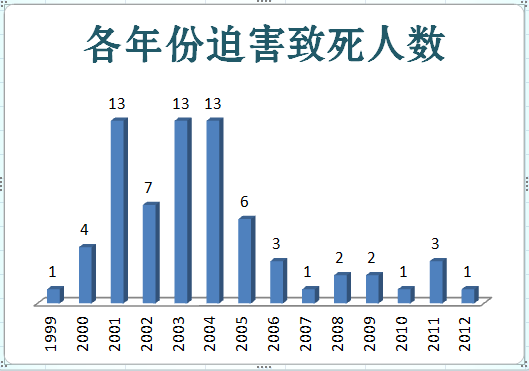 我们对七十一名被迫害致死的法轮功学员进行案例整理,发现至少有五十八人被非法关押迫害,有的被活活打死,有的被杀人灭口,有的遭野蛮灌食迫害致死(一人食管被切开,一人被灌药物致疯,一人遭酷刑后被灌毒药灭口),王虹一家祖孙三人在迫害中身亡。几十人遭受各种酷刑:老虎凳、吊打、电击、曝晒、死人床、上大挂、背铐、关铁笼子、浇开水烫、性虐待等迫害。