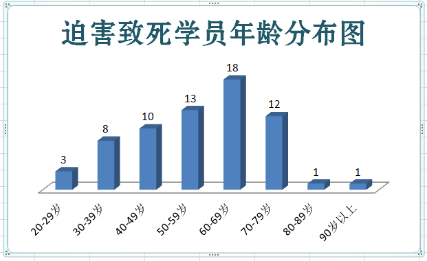 已确认被迫害致死的七十一名大连法轮功学员中,已知性别的有七十人,其中女学员四十二名,占60%,男学员二十八名,占40%。迫害致死年龄最大的是九十岁,最小的二十二岁。六十岁以上三十二人,占46%。