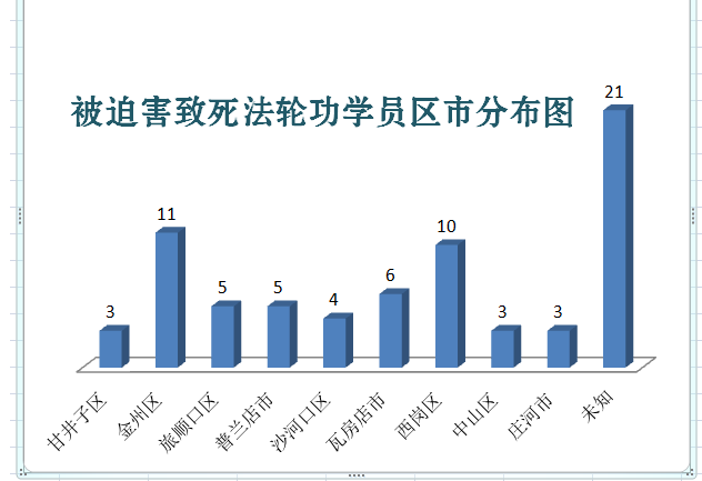 二零一三年十二月明慧网发表了《中共酷刑虐杀法轮功学员调查报告》,结果显示,已经确认的1999年—2013年大连被中共迫害死亡的法轮功学员人数为七十一人,位居全国前十恶城市。另外,还有五十四人被迫害致死的消息在明慧网曝光,需要明慧网信息中心的进一步复核确定,实际大连地区法轮功学员被迫害致死人数为一百二十五人。