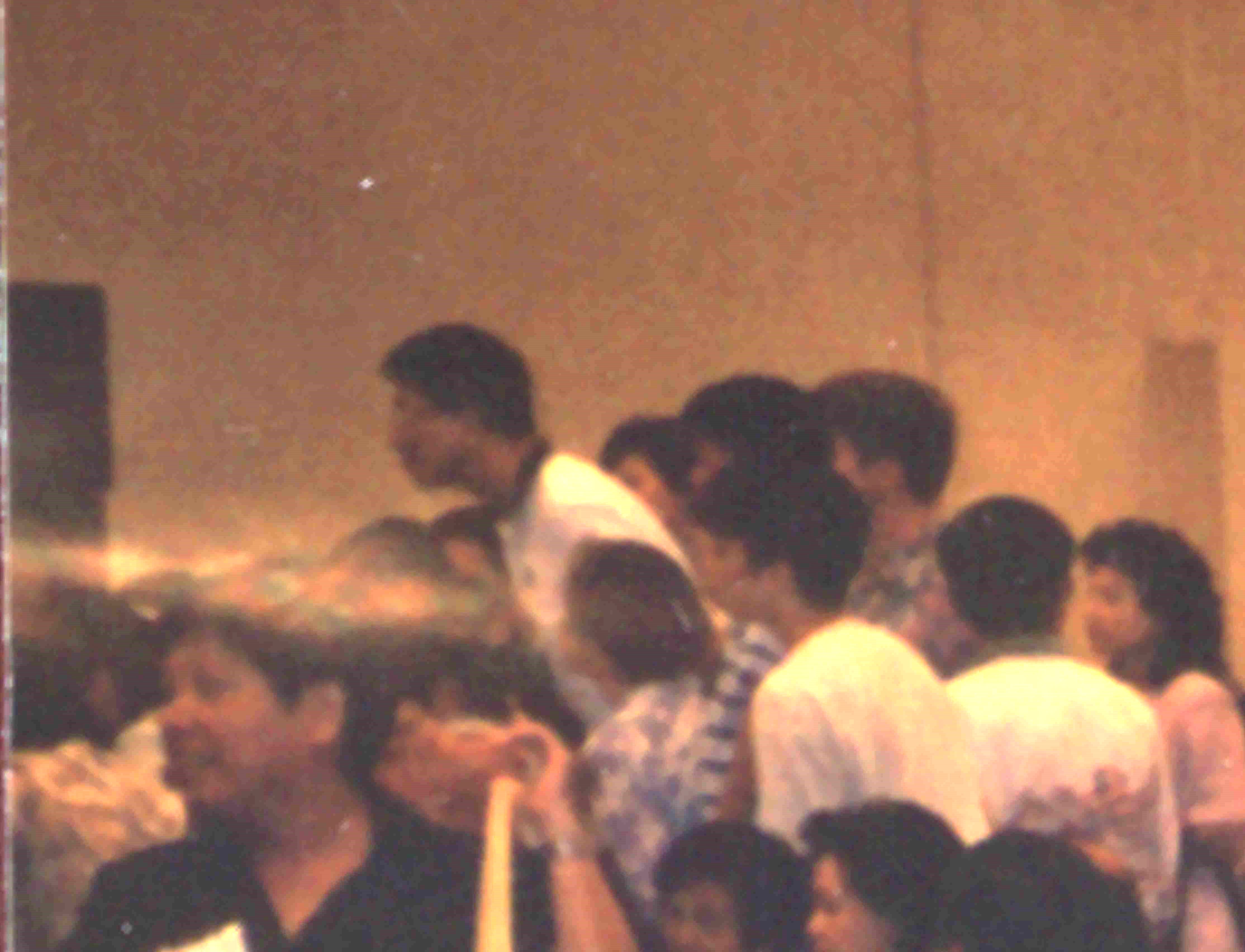听到了师尊针对我爱吃生鱼片这个执着的这一句讲法之后,我心满意足的回到我自己的那个交流小组。这时有一位国内来的小弟子正在背法,让我很感动,于是我就把这个小弟子背法的场景给拍照了下来。就这么一照,还真不得了。当我把这个照片洗出来的时候,我发现在照片左上角处有一个旋转的法轮,而且法轮出现位置的那个背景人群恰恰正是师父还在参加讨论的那个小组人群,也就是我刚刚从那边回来的那个小组。