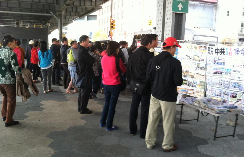 在真相点,两周前,一位义工遇到一位女士,六十多岁的样子,一看派头就不是一般的人,身边还有两个人跟着。这位女士跟旁边一人嘀咕了几句,马上一个像秘书的人过来问她:“你有没有《转法轮》?”义工告诉他可以上网看,还可以到天梯书店去买。他说:“我们来不及了,马上要走了。”义工告诉他说,“那我把自己这本给你吧,我这本看旧了,你拿去看,但要珍惜。”他说:“好,我们会珍惜的。”他接过去了,又拿了一些真相资料,说:“我们要回去研究研究。”然后就走了。