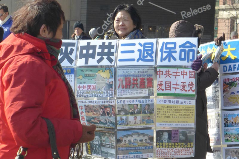 有一次大陆游客一下车,看到举着展板的退!党!义工就指着骂:“你们是卖国贼、不爱国。”义工对他们说:“你们都是爱国的,我知道。但是中共不是中国,它不代表中国,它是反对神佛的,中国五千年文明讲天人合一,是神传文化,是讲道德的,法轮功就是一个教人提升道德的功法,按‘真、善、忍’做好人的,但是中共为了一己私利,利用权力做恶,现在大势已去了,就等着淘汰。”一讲完,一拨人里面就有五、六个对着义工点头笑,有人说:“对对对,我们心知肚明,但是不敢说。”