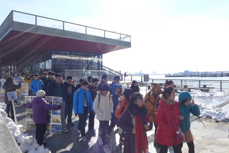 !党!义工每天风雨无阻,在此坚守了多年。'>真相展板后面是大陆游客大巴。参观完自由女神像回来的游客在此集合,他们边等人边看真相资料。右边蓝色小推车,每天将这里的真相条幅、资料收纳整齐。退!党!义工每天风雨无阻,在此坚守了多年。 |
