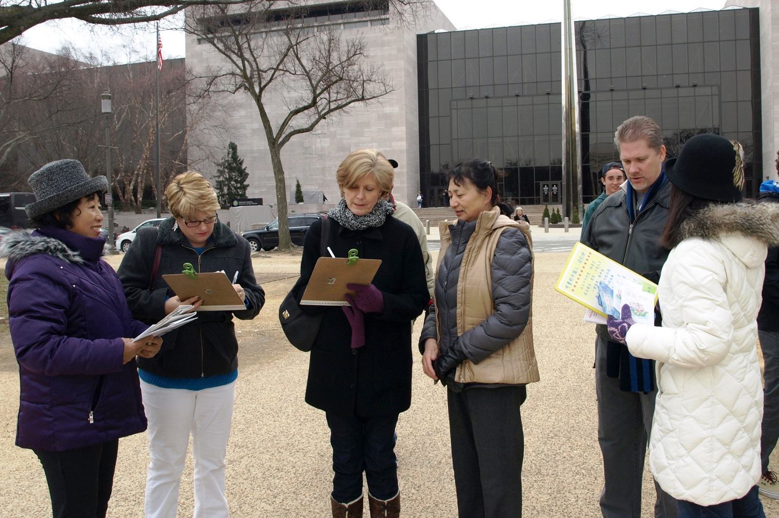 今年冬天华盛顿DC的天气异常寒冷,冰雪天气比往年更多,但大陆游客和往年相比,不减反增。公费旅游的官员少了,扶老携幼的普通游客增多了。很多游客一下车,就迫不及待的来到真相点,站在横幅前面拍照;也有些人大声的念着:“没有了共产党,中国才有希望”“中国不等于中共”,有人说:“对,这可都说到我心里去了!” 有人则是静静的一块又一块的阅读展板内容,并拍摄下来,拿回国带给亲朋好友看。
