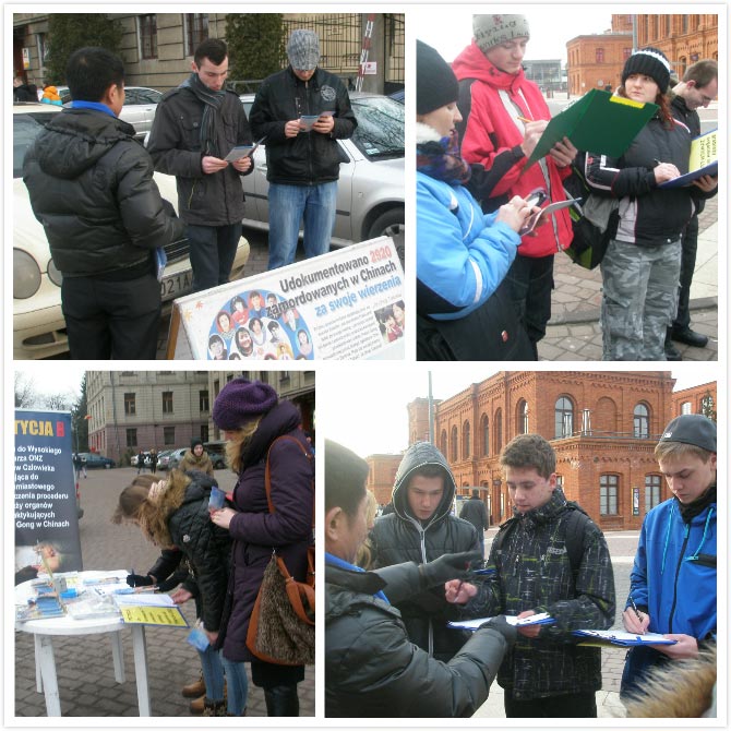 一队年轻的姑娘和小伙子在法轮功真相展板前路过,一个人突然说道:“停下,停下,快来看,这不是前天三台(指波兰广播电台三台)广播的活摘炼功人器官那个事吗?真吓人啊,这是真的啊,这是炼法轮功的,是对炼法轮功学员的迫害。”当即二十多名年轻人排队签名,临走前,每人都向法轮功学员发出衷心祝福:“祝你们好运!(Powodzenia)!”