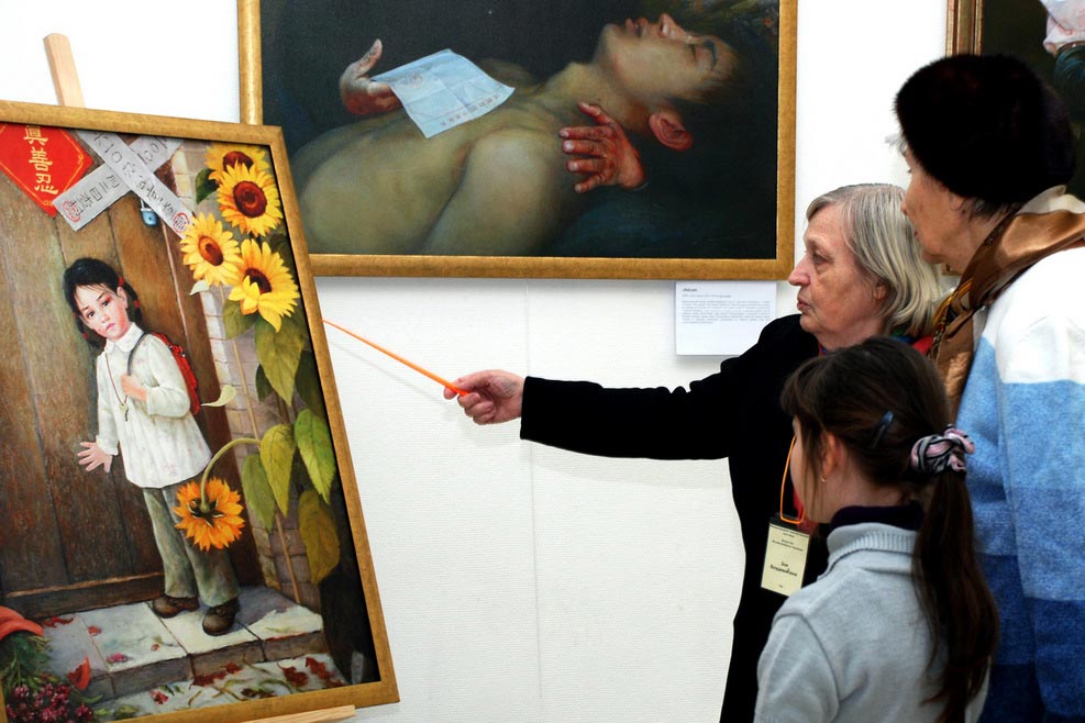 来参观的有附近的居民,也有老师带着好多小学生过来了,也有大学生们,来的时候带着各种各样的面目表情,法轮功学员为一群一群的来访者耐心和善的讲解每幅画所展现的内涵,了解真相的人们走时面目表情几乎是一样的,带着祥和和感恩的微笑。