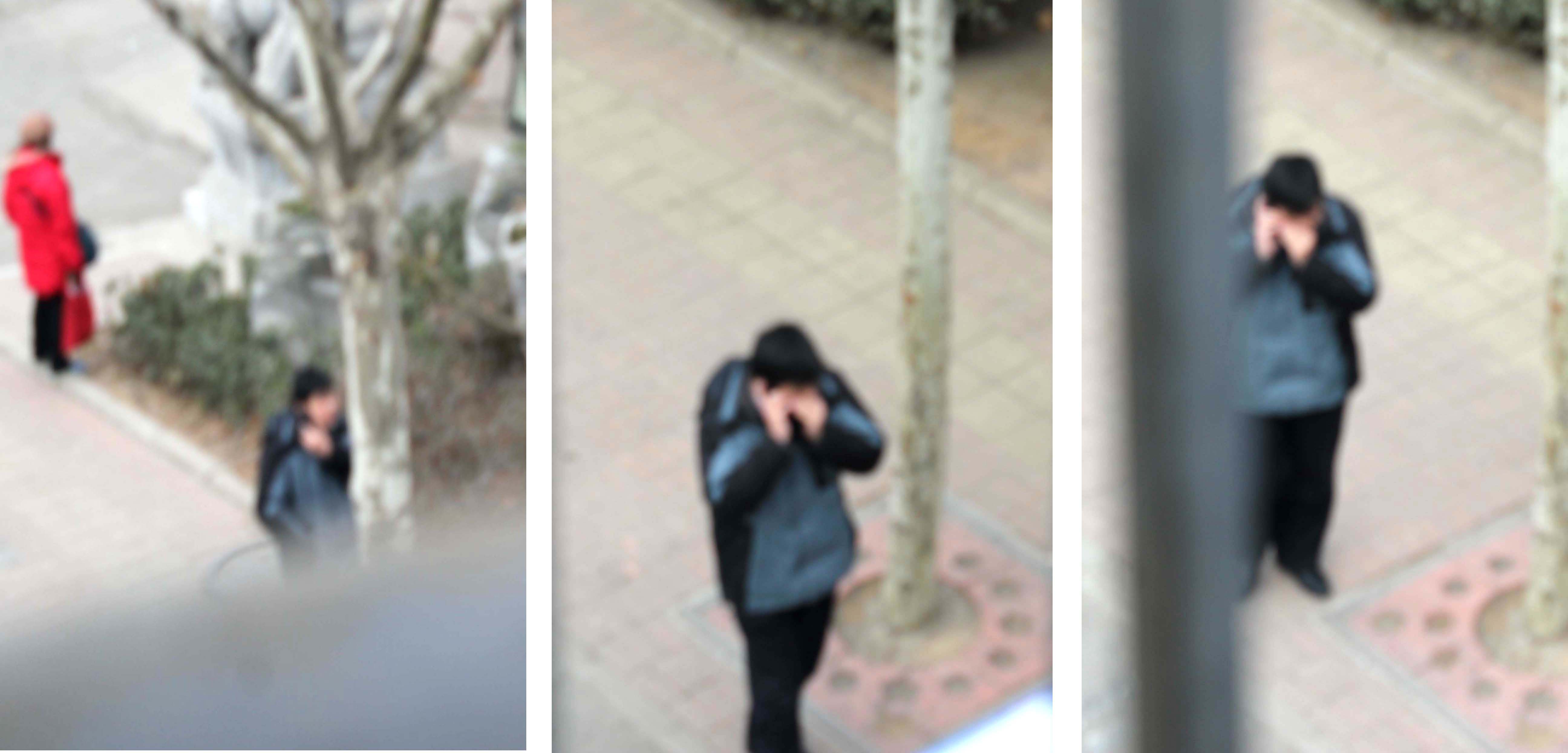 二零一四年二月二十六日,对姜国波非法判刑的刑满到期,亲友到山东省监狱接他回家。当天潍坊市610一名恶警(下图)在山东省监狱门前捂着脸到监狱大门外打探消息,偷拍在大门口附近准备迎接姜国波的亲友,到处寻找潍坊车牌的车辆打电话汇报。此人驾驶车号(鲁VSK970)的黑色帕萨特。