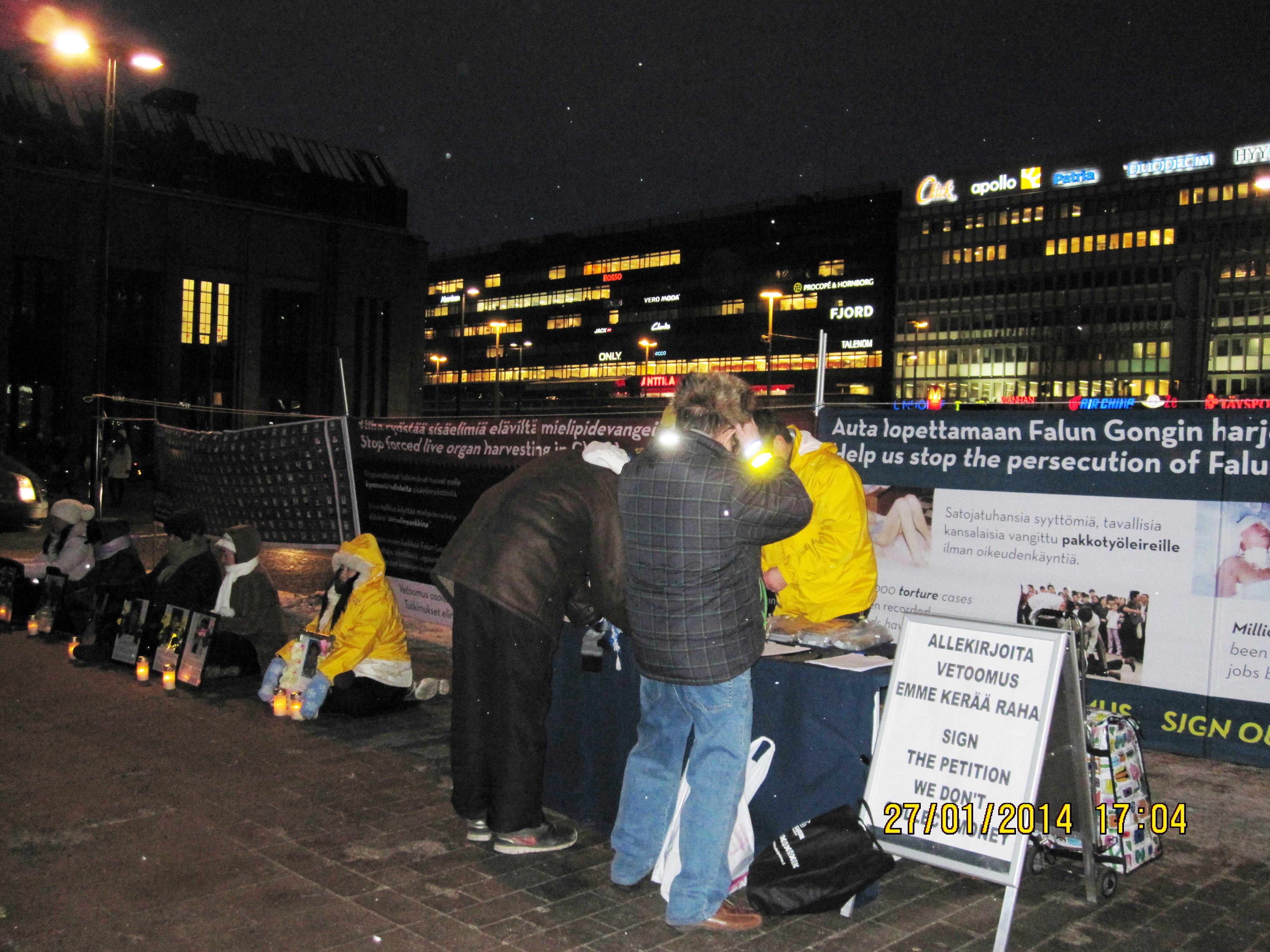 ![]() 图:反酷刑纪念日,法轮功学员在芬兰首都赫尔辛基火车站广场举办烛光守夜活动 |