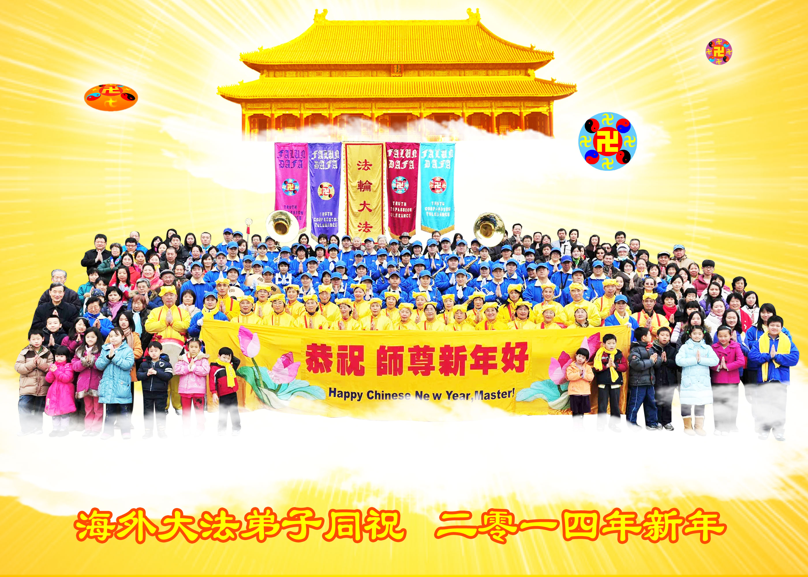 【明慧网二零一四年二月五日】(明慧记者荷雨/肖妍综合报道)传统新年是华夏儿女阖家团聚、辞旧迎新,表达对天地的敬畏、感恩和诚敬的最隆重节日。在甲午新年来临之际,如往年一样,来自世界各地、各行各业的各族裔法轮功学员及亲友通过明慧网,以自制的精美贺卡、贺辞、视频、诗画和乐曲,向李洪志师父献上节日问候和生命最深切的感恩。