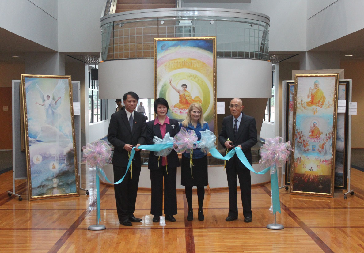 ![]() 出席开幕式的嘉宾在为画展剪彩 |