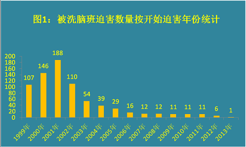 我们结合明慧网《中共酷刑虐杀法轮功学员调查报告》统计的3653个被中共迫害致死的法轮功学员案例,统计到其中有746名学员在生前遭到过中共洗脑班(包括精神病院/黑监狱)共851次迫害,其中367名法轮功学员被洗脑班直接迫害致死(367例中,有2例属于2013年下半年洗脑班迫害致死案例,为本报告新增,以下同)。在这851次洗脑班迫害中,有753例记录到明确的洗脑班开始迫害时间,我们按年份对此进行了汇总统计,结果显示,在中共公开全面迫害法轮功的一九九九年,洗脑班就已经被大规模地应用到迫害法轮功之中,一九九九年有107例,二零零零年146例,二零零一年188例达到高峰(图1):