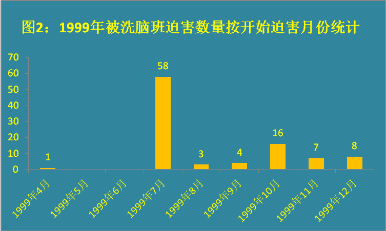 在图1统计到的一九九九年洗脑班迫害的107例案例中,有97例案例记录到了具体被洗脑班迫害的开始月份,我们对此进行了统计,结果显示(图2),一九九九年七月二十日中共全面公开迫害法轮功后,洗脑班这种迫害形式在七月这一个月一下子就上到最高峰,显示使用洗脑班迫害法轮功的情况是从迫害开始的那一天就迅速覆盖了全国。例如,一九九九年七月二十一日,在中共正式对外宣布全面迫害法轮功的第二天,黑龙江省依兰县珠山乡政法委书记李传富和村干部等人就按照中共的迫害政策成立了一个临时洗脑班,对当地爱民村等炼法轮功学员搞人人过关,通过心理和暴力恐吓等手段强迫学员放弃修炼。九月二十九日,爱民村原法轮功炼功点辅导员赵喜春(男)因此死亡。