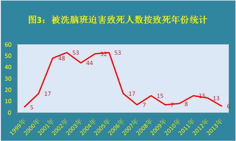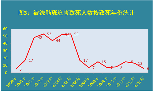 二零一三年十二月,明慧网发表《中共酷刑虐杀法轮功学员调查报告》,统计了3653名被中共迫害致死法轮功学员案例,其中11%共746名学员在生前遭到过中共洗脑班(包括精神病院/黑监狱)共851次迫害。另外,根据该报告的统计,在2383个被中共关押迫害致死法轮功学员案例中,有365名法轮功学员被洗脑班(包括精神病院/黑监狱)直接酷刑虐杀致死(表1),占所有被中共关押迫害致死案例的15%:
