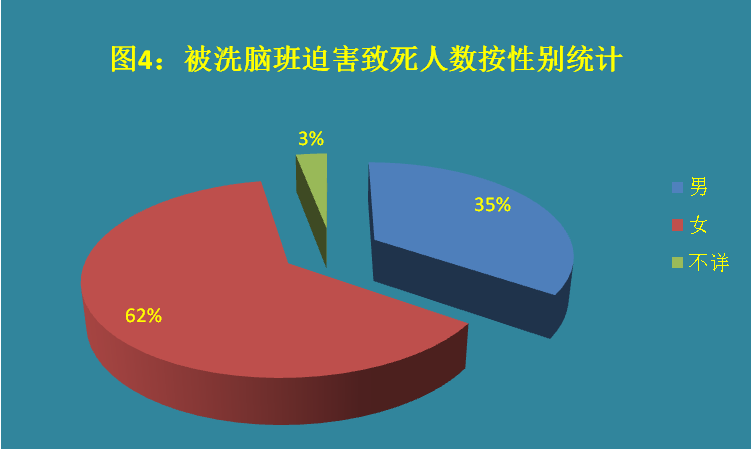 在367名被中共洗脑班虐杀致死法轮功学员案例中,有356例记录有被害学员具体的性别,我们对此进行了统计,结果显示, 62%被洗脑班虐杀的法轮功学员为女性(图4):