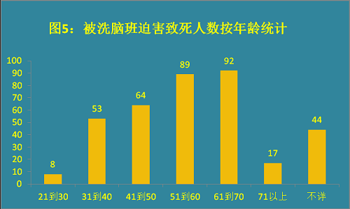 在367名被中共洗脑班虐杀致死法轮功学员案例中,有323例记录有被洗脑班虐杀致死时的年龄,我们对此进行了统计,结果显示,61到70岁高龄法轮功学员被洗脑班迫害致死案例最多(图5:):