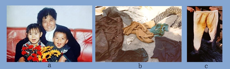 ![]() a、陈子秀生前和两个孙儿合照,b、被恶徒丢弃在院落浸透着血渍的陈子秀的全部衣物。陈子秀亲属们在悲愤中摄下的,c、内衬裤上的血渍与泄出污物痕渍 |
