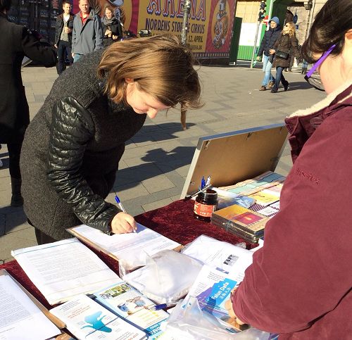 一位女士主动过来在征签表上签名,还帮她先生签了名。她说很希望更多的人站出来支持反迫害,早日停止这种罪恶。