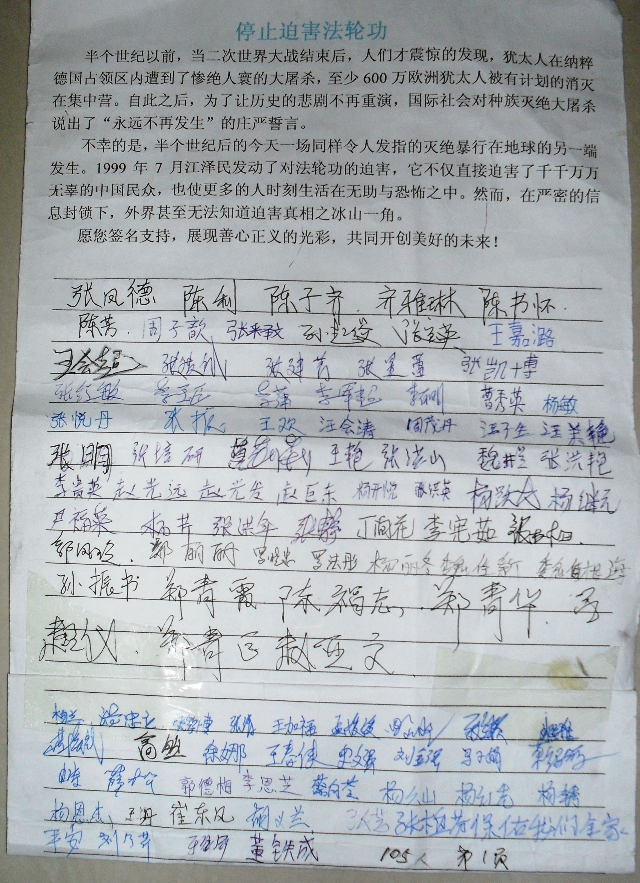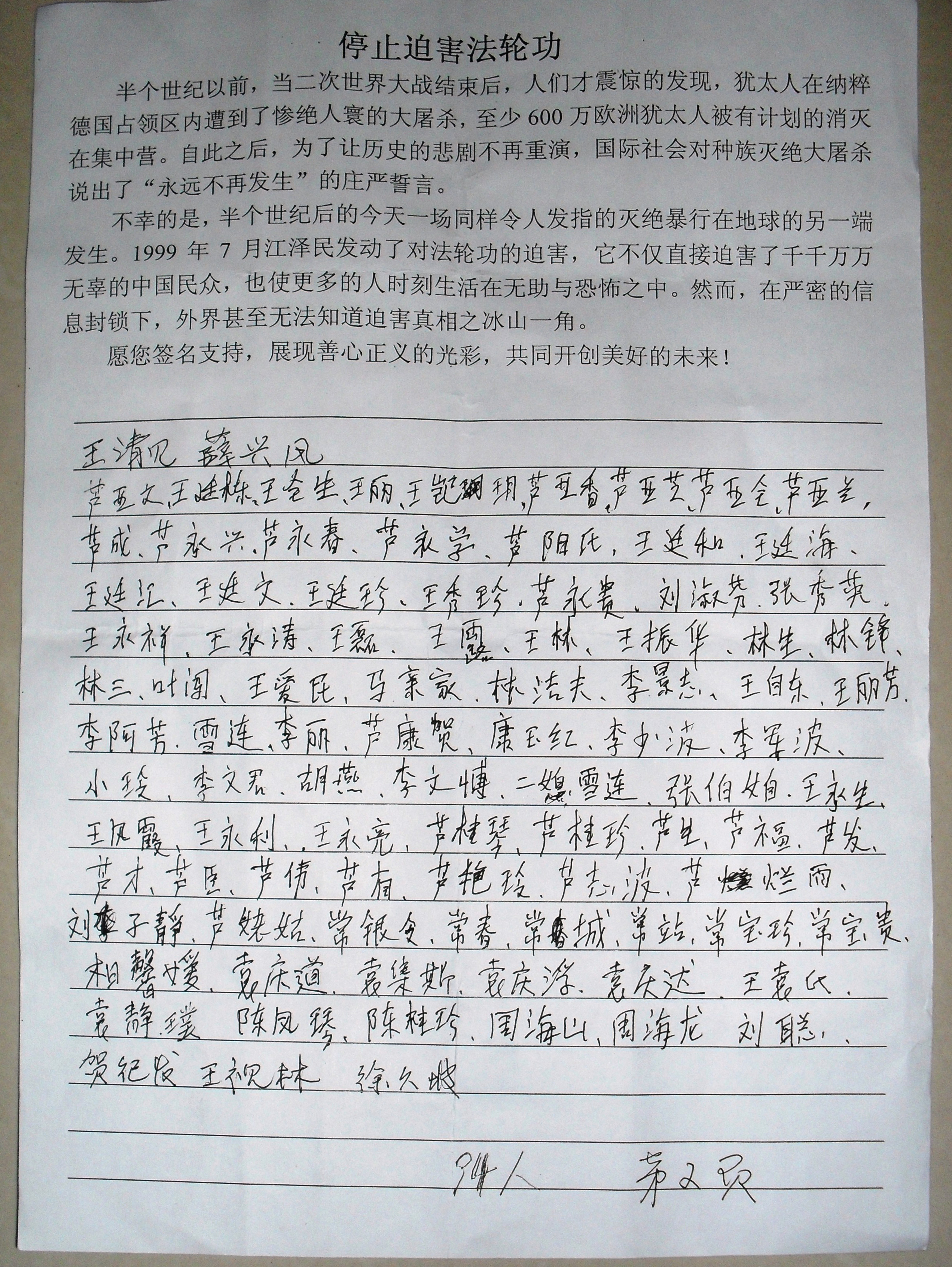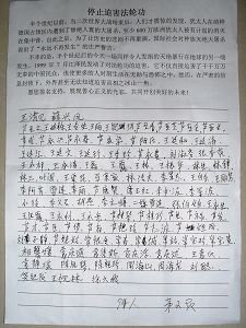 以“停止迫害法轮功”为标题的征签表上写道:1999年7月江泽民发动了对法轮功的迫害,它不仅直接迫害了千千万万无辜的中国民众,也使更多的人时刻生活在无助和恐怖之中。然而,在严密的信息封锁下,外界甚至无法知道迫害真相之冰山一角。