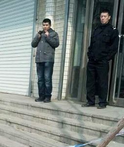 ![]() 法警拦着不让夏元新的妻子和女儿进去旁听。 |