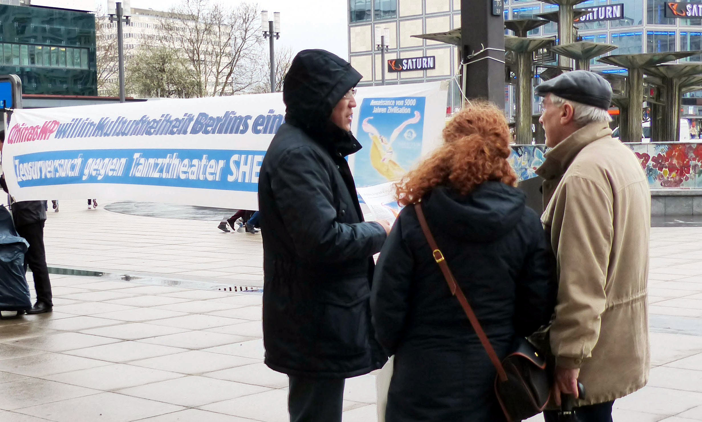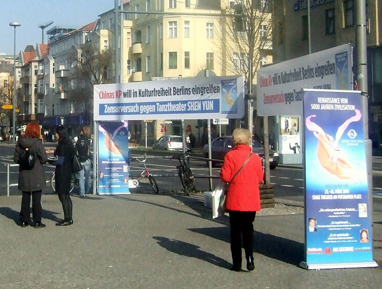 从二零一四年三月十八日开始,在德国柏林陆续十几处地方都有法轮功学员在拉横幅和分发资料,曝光中共妄图干扰神韵演出的丑行。看到横幅拿到资料的德国民众,很多都发出了以上的惊呼,人们几乎不敢相信他们听到和看到的事情,很多人表示要到剧院看演出,以声援神韵艺术团。