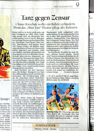 另一家受柏林中上层社会喜爱的《每日镜报》(Der Tagesspiegel)也于三月十九日用《舞蹈对抗审查——中使馆试图阻止芭蕾舞演出,因为神韵维护传统文化》为题,报道了中使馆企图阻止神韵演出的消息。报道中提到,中使馆对神韵演出的干扰没有成功,还起到了意想不到的宣传效果,法兰克福中领馆似乎已经放弃了给剧院施压的尝试。