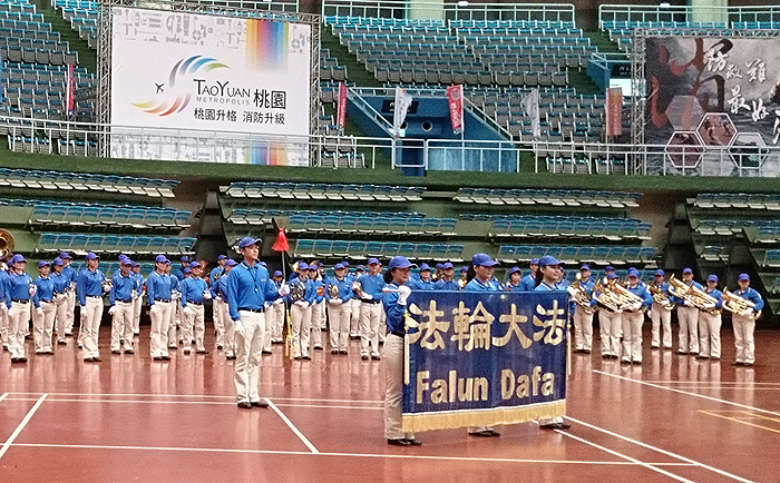 竞技大赛一开场,由天国乐团演奏《开幕乐》启动典礼,随后以《法轮大法好》、《法鼓法号震十方》、《送宝》三首乐曲引领各分队义消选手进场。一整天的竞赛中,天国乐团振奋人心的乐音,不但鼓舞选手添正气,也带给观众美好愉快的感受。桃园县政府消防局局长谢景旭表达对乐团的感谢:“谢谢天国乐团来参与我们的活动。”