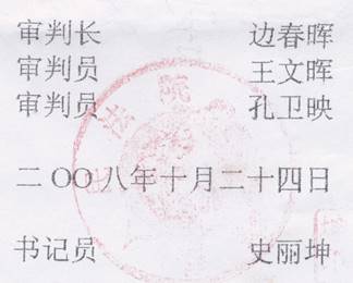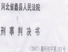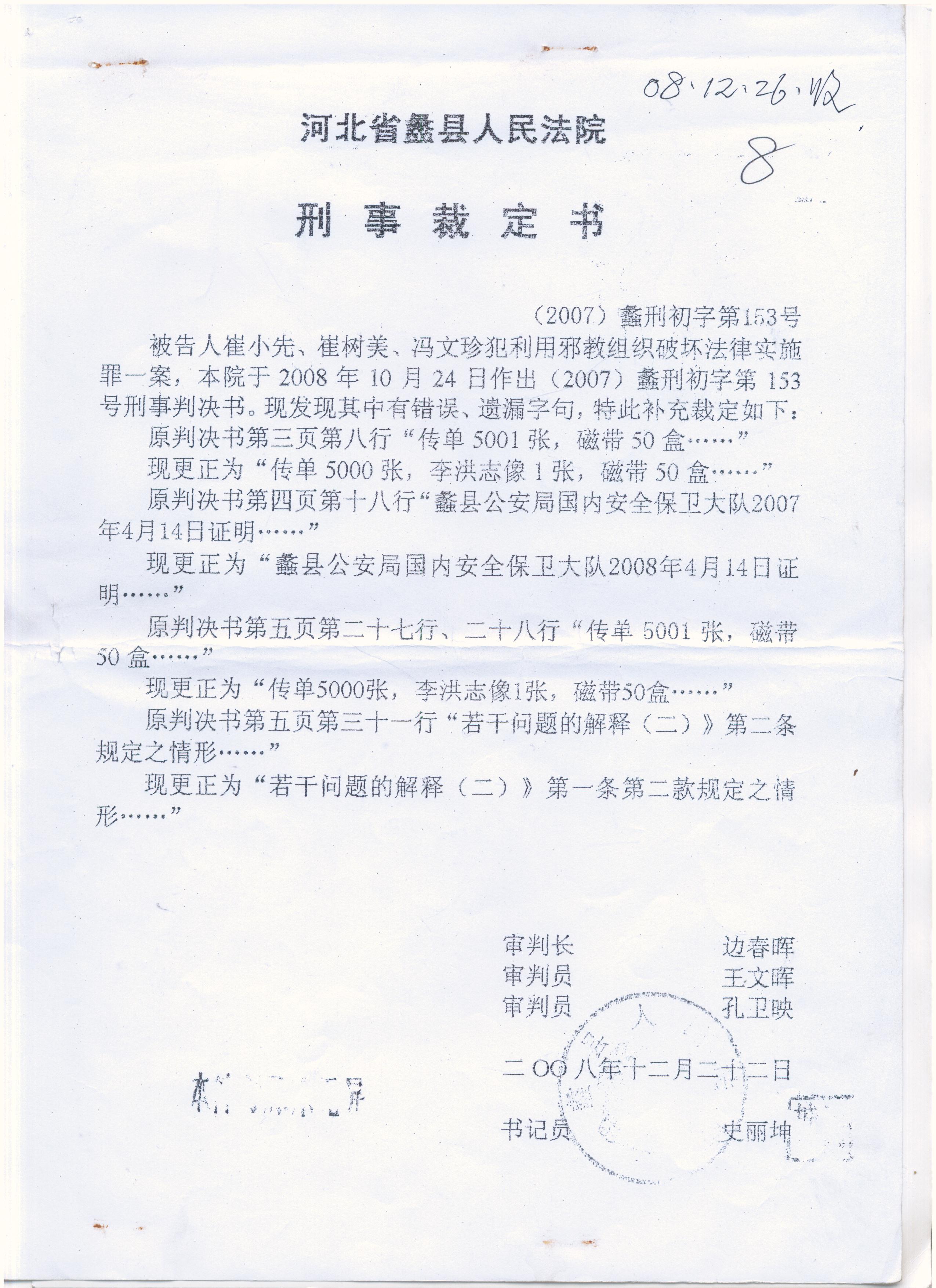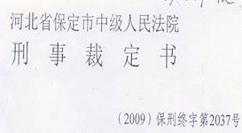 三位老太太的律师曾联名向保定市中级法院提出蠡县公安局、检察院、法院违背事实、与宪法相悖之处,保定中级法院却置之不理,却以“事实清楚,量刑适当、审判程序合法,”维持原判。(图是蠡县法院在2008年10月24日审理终结后于2008年12月22日出的违法的裁定)