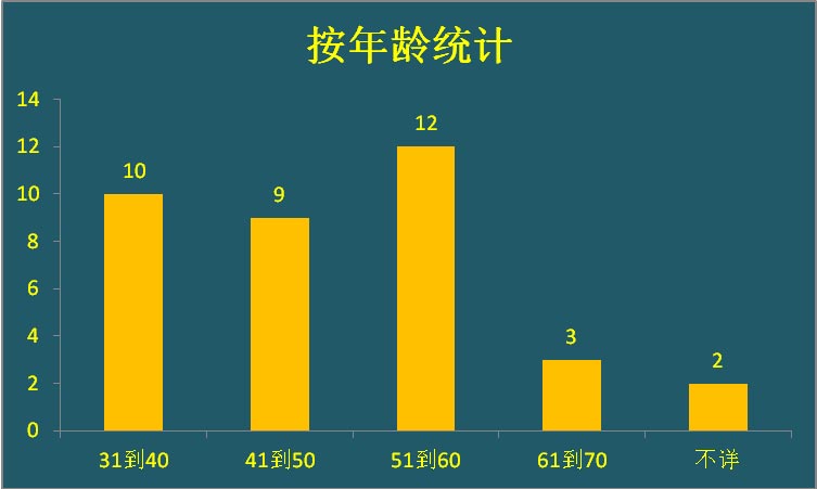 从年龄来看,36名学员中,年龄最大的是来自湖北的刘晓莲(女,68岁),年龄最小的是来自山东的苏刚(男,32岁)、河北的荣凤贤(女,32岁)。总的来说,51到60岁年龄段最多: