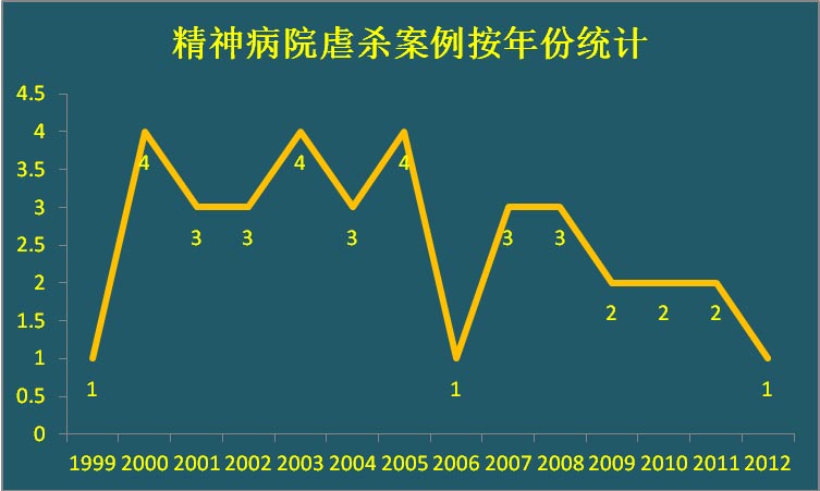 从被虐杀时间来看,从一九九九年到二零一二年这十三年间,精神病院虐杀法轮功学员案例时有发生,其中二零零零年到二零零五年是精神病院虐杀法轮功学员的高峰: