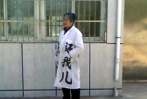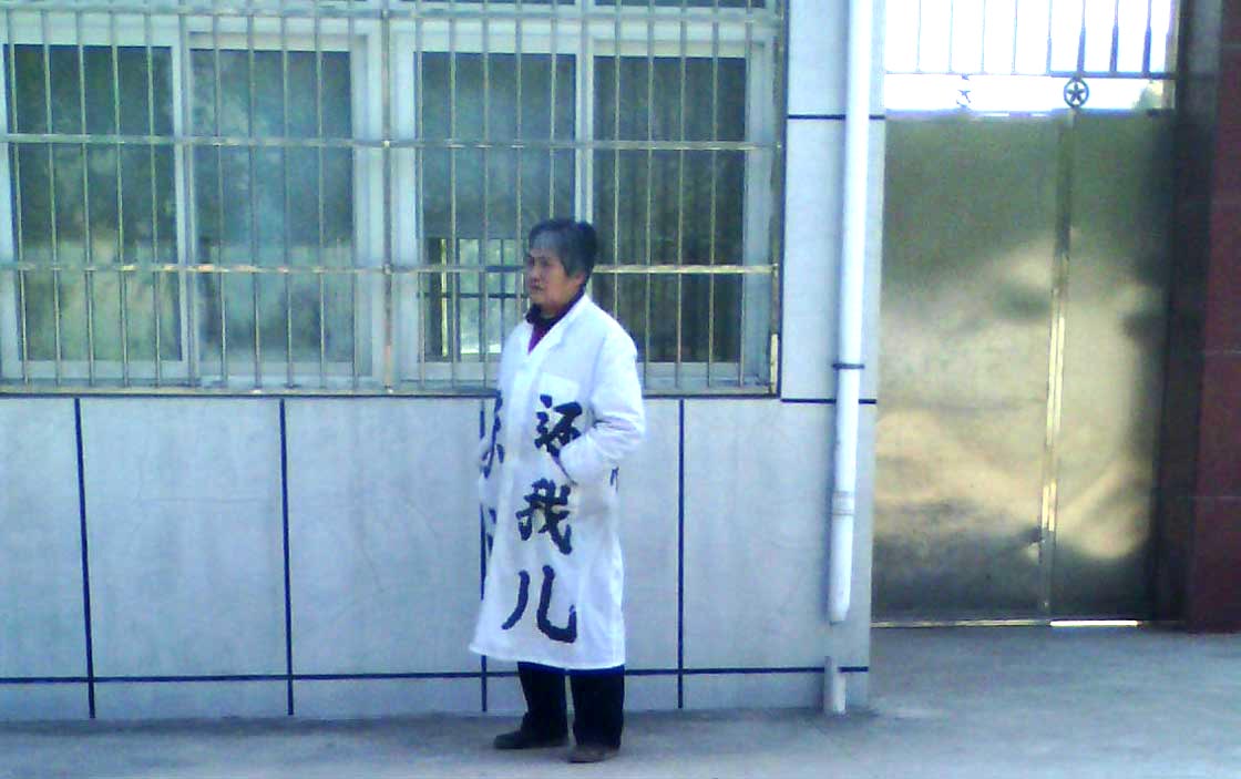 陈松老母身穿“还我儿陈松”有字衣服,站在所谓“法制教育中心”(即湖北省洗脑班、武汉板桥洗脑班)门口,要求释放无辜被抓的儿子。