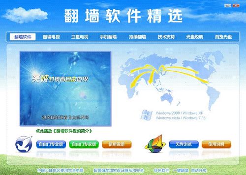 本次提供的启动包在前两个版本的基础上進行全面更新而成,运行界面美观、功能方便实用,含最常用的翻墙软件、翻墙电视软件、其它相关软件、卫星接收的教程、常见问题解答以及视频和文字介绍等。