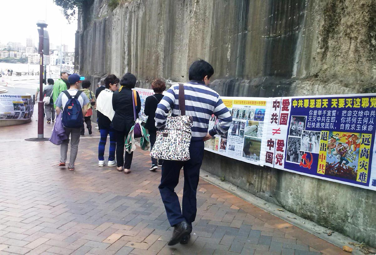 有一次在悉尼歌剧院边,四、五个干部模样的中国男子站在一起聊天,退!党!义工上前问候:“兄弟,你们是家乡出来的吧?”他们说是河北的。义工说:“我先生祖籍河北,我们是真正的家乡人了,欢迎欢迎。”交谈中得知这个人是书记,那个人是主任。义工对四十出头的书记说:“现在国内天灾人祸太多,是奔共产党去的。贵州平塘县两亿七千万年前形成的石头上长着‘中国共產党亡’六个字,那是在警示人。我希望家乡每个父老乡亲都平安。”“我们每个人都在入党团队时举手发誓:为共产主义奋斗终身,把命都交给它了,不安全哪。我知道中央好多高官在海外退!党!了;中央党校四十六名官员带名单去香港退!党!;前年有位部长在那边的咖啡吧退了党;去年八月,中央军委高官一行人在歌剧院那儿退了党。现在已有超过一亿五千万人做了‘三:退.’,我也帮你退了吧?”