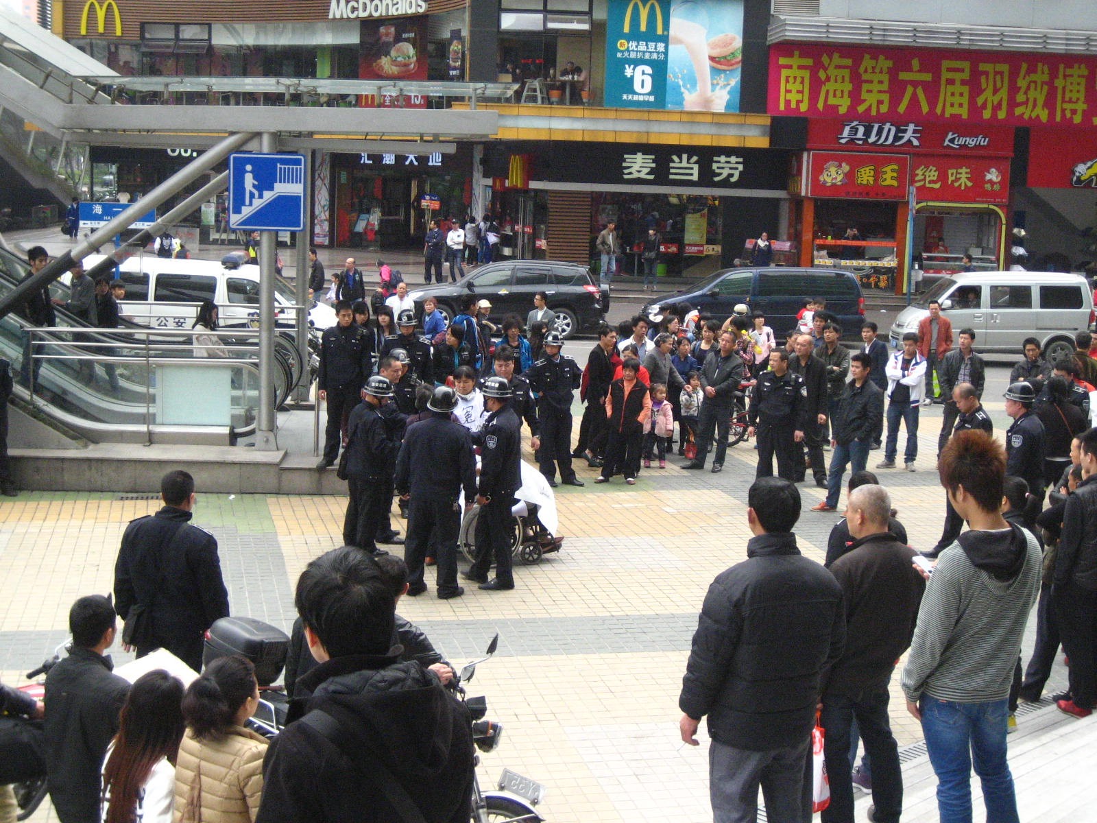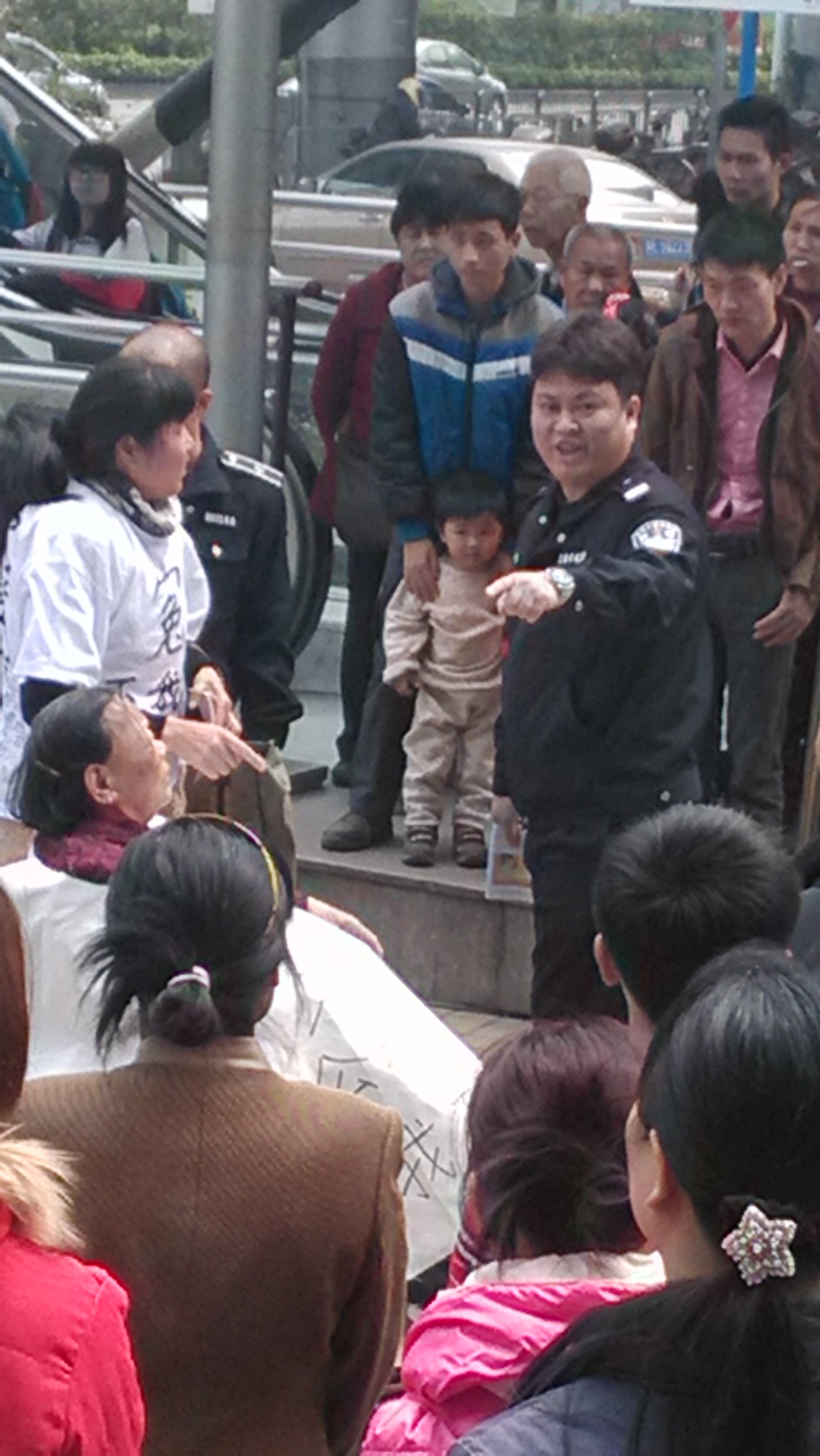 三月二十二日,阿娟的母亲在得不到有关部门的答复后,再次坐上轮椅,让儿媳谢瑞香推她到佛山市南海区桂城南海广场。当时正是中午时分,广场上人来人往,老人家坐在轮椅上,一边向路人讲述邓彩娟近期被无故迫害的遭遇,一边派发阿娟多年来所受到多次残酷迫害的申诉资料。人们了解了真相后,都很同情老人家,纷纷谴责中共邪*党-恶警的暴行。