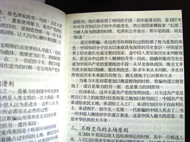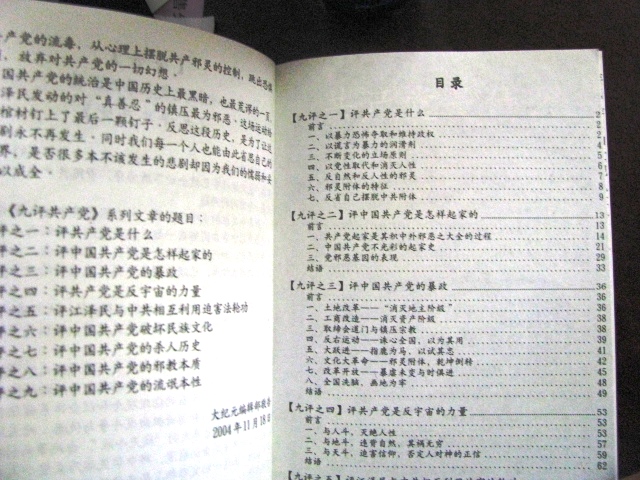 我曾经在资料点待了很长时间,也做过各种版本的《·九·评*共产党》,但还是第一次见到台湾制作的版本,所以比较好奇,特意打开看看,但让我感到失望的是,这本书的制作比较粗糙,比如里面有很多地方外页边距几乎只有1毫米宽,一翻书就会摸到字,估计是同修做的时候裁剪和打印出的问题造成的。