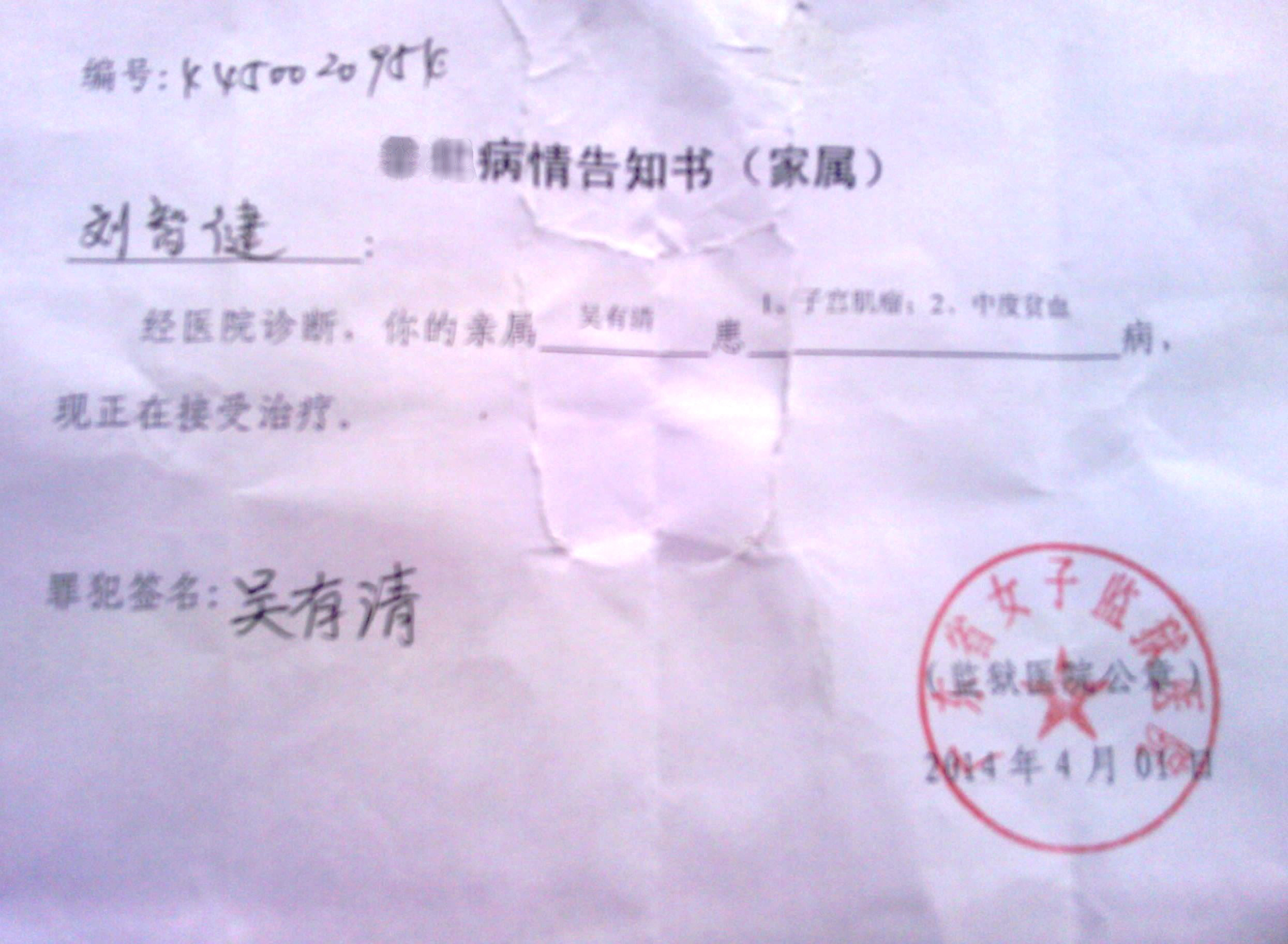 吴有清家属二零一四年四月十五日收到来自广州女子监狱医院的通知,称吴有清现患有子宫肌瘤、中度贫血症。告知书的日期是:二零一四年四月一日,见附图。