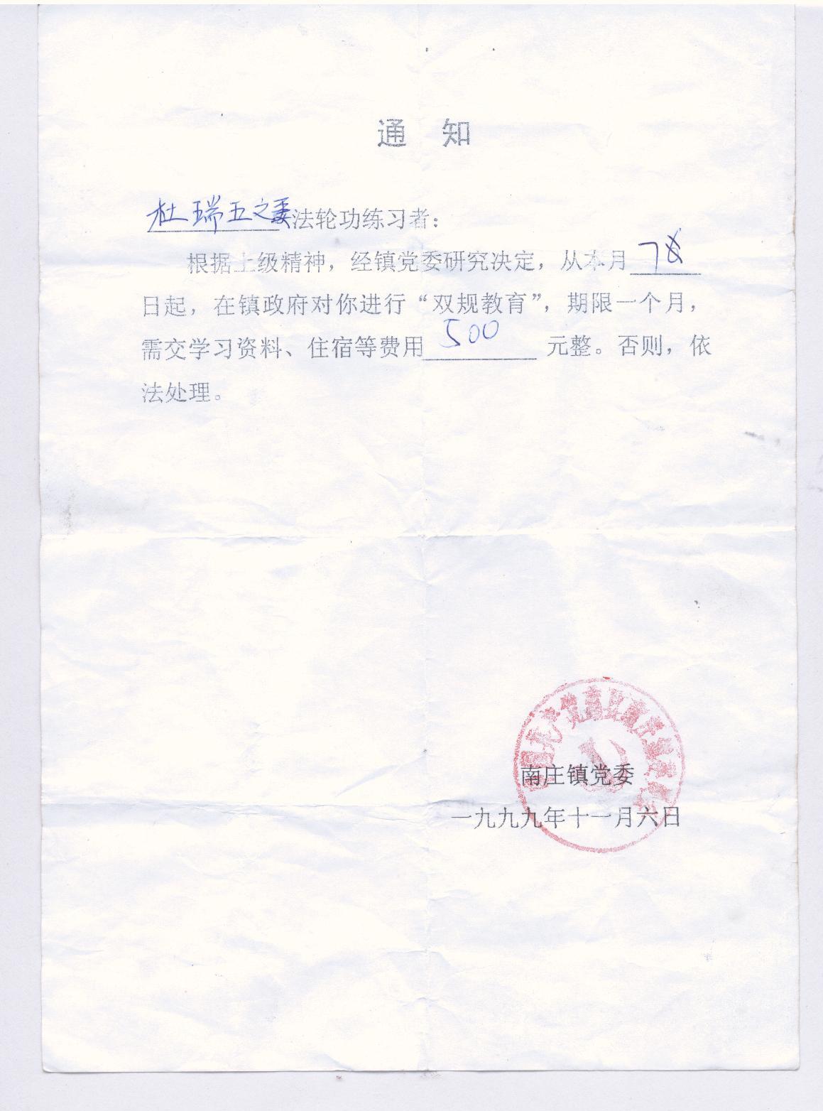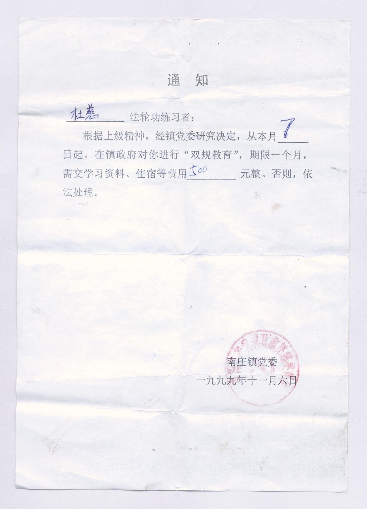 自从法轮功被迫害后,杜志民和张素云一起,被南庄乡和南庄派出所的史占洪(司机)开车去家骚扰,她和张素云被叫到乡政府,非法拘禁七八天,被敲诈罚款五百元。